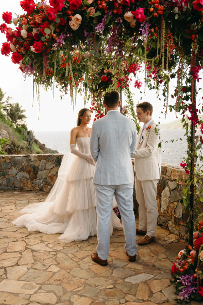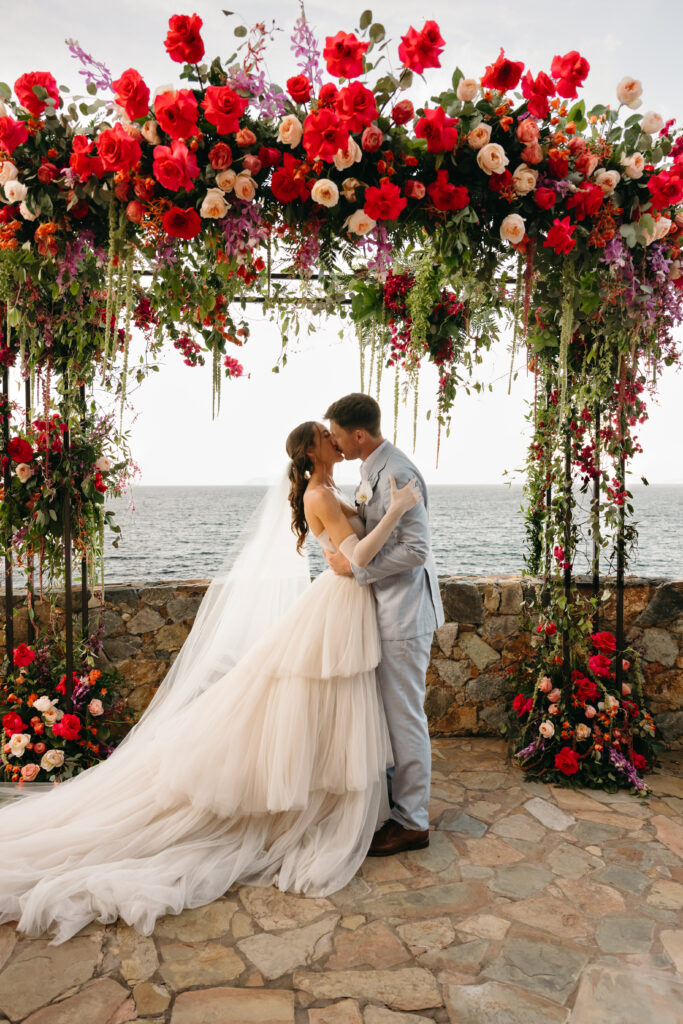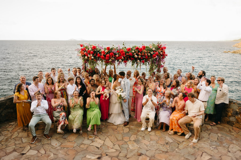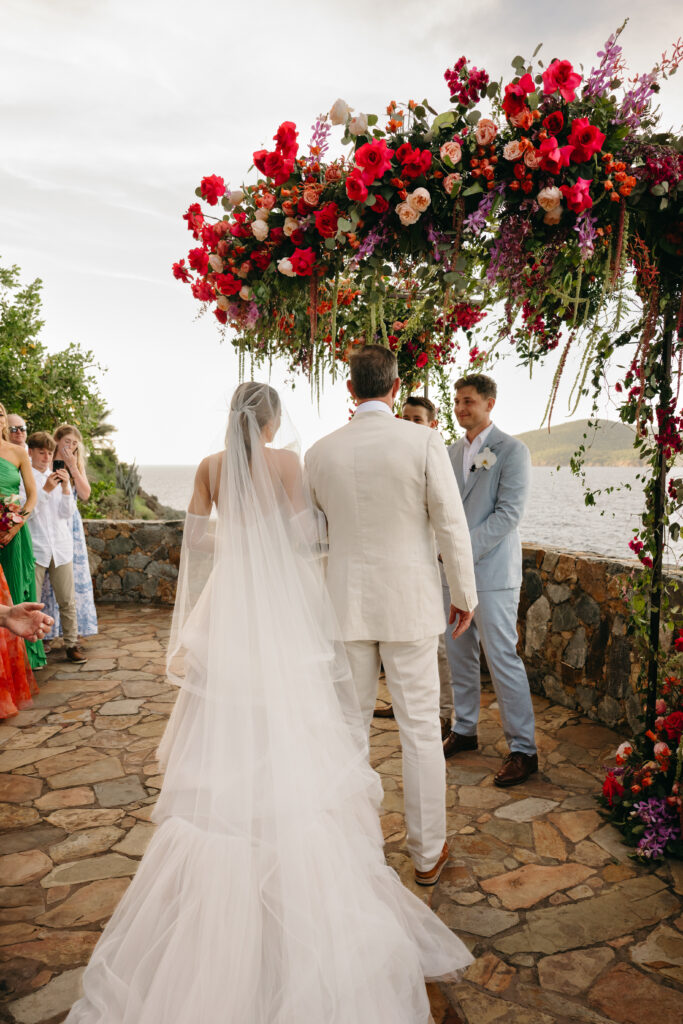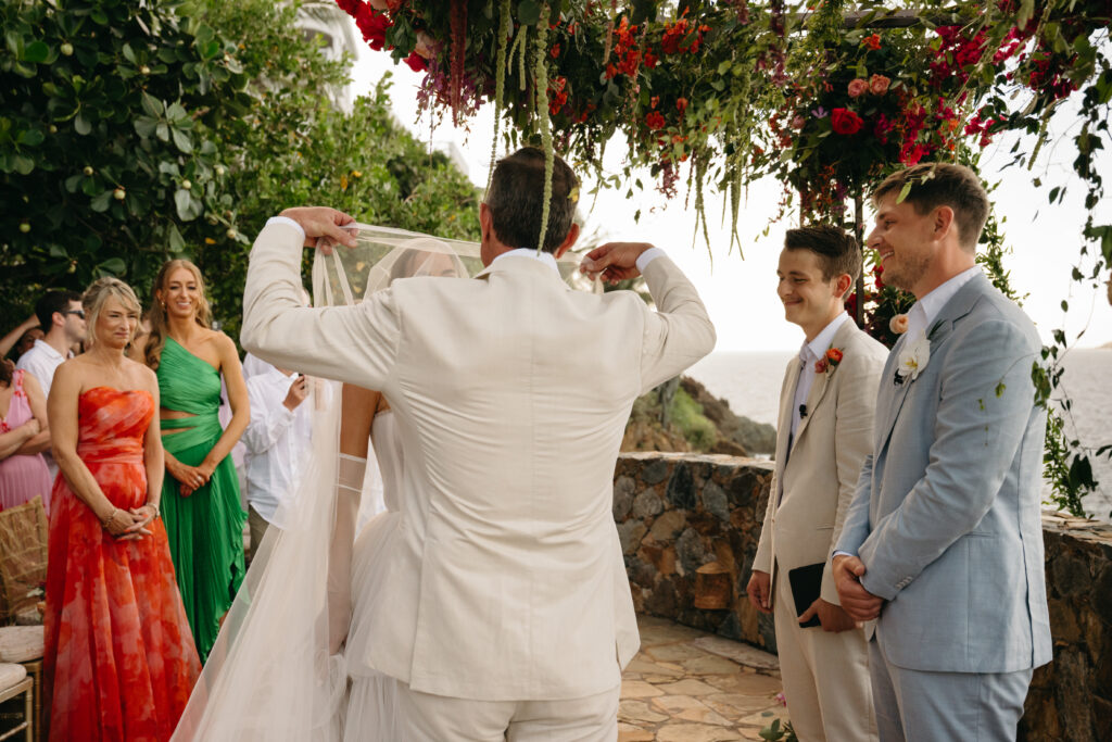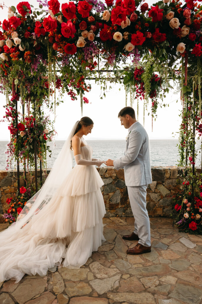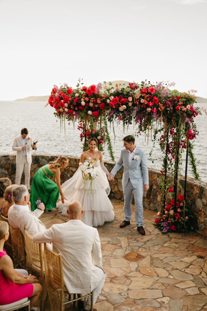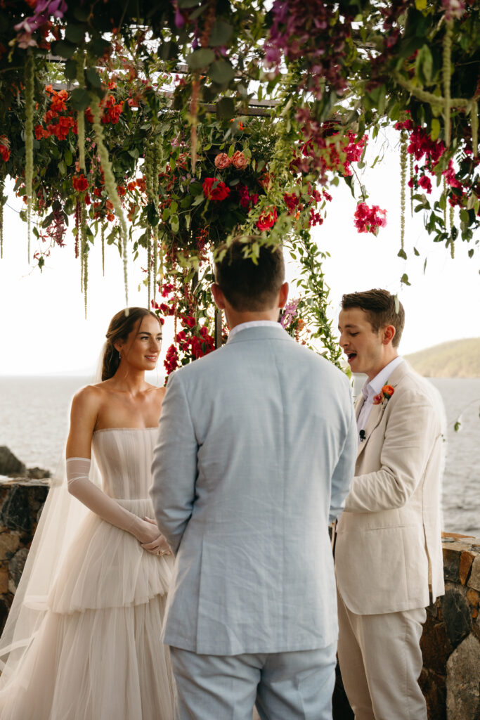 The ceremony arch was an absolute showstopper, overflowing with lush blooms in romantic tones. Every corner of the decor was adorned with flowers, creating an atmosphere that felt luxurious yet full of island charm. They exchanged their vows surrounded by their closest friends and family, while the waves crashed below them there were cheers of pure excitement and joy!