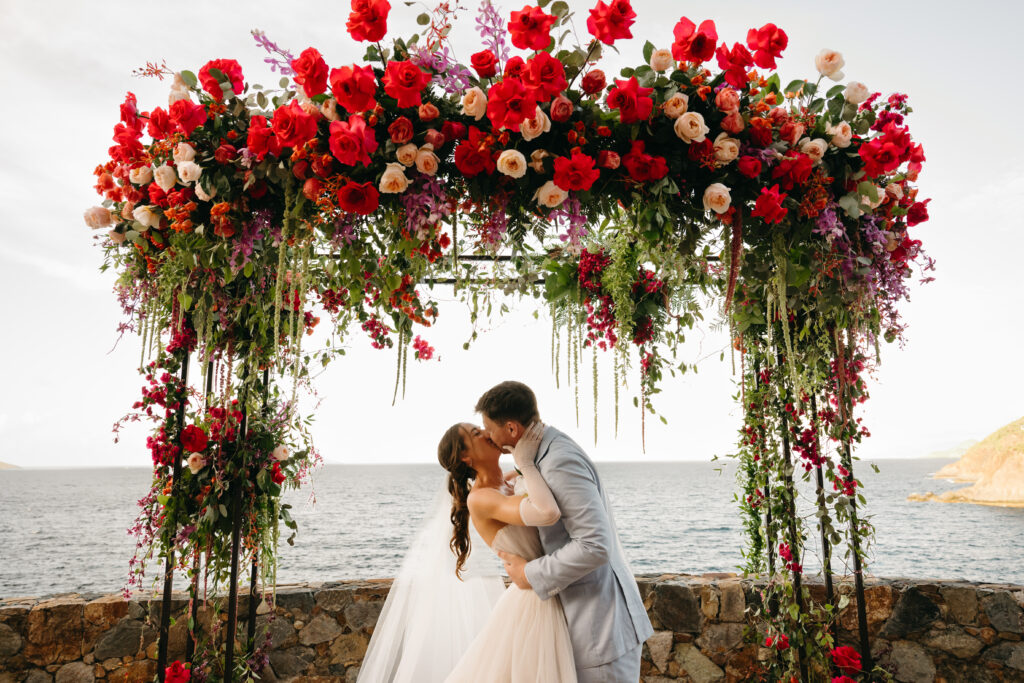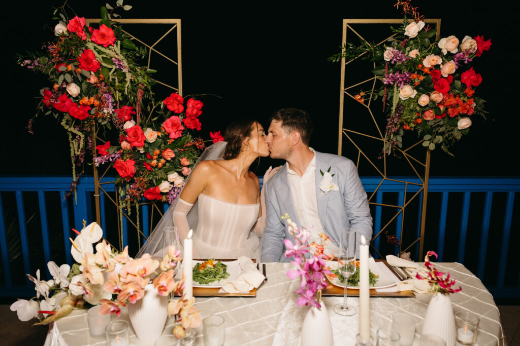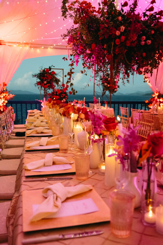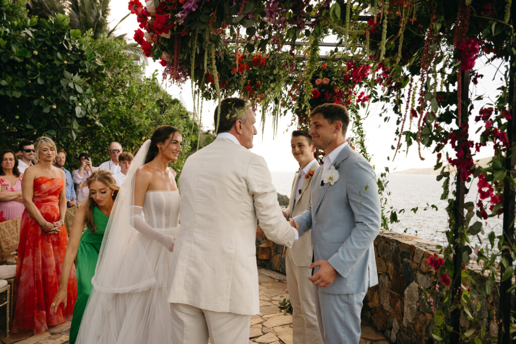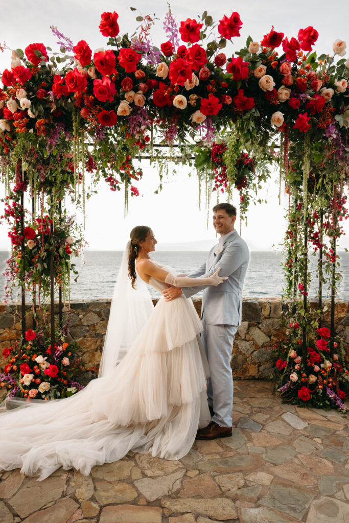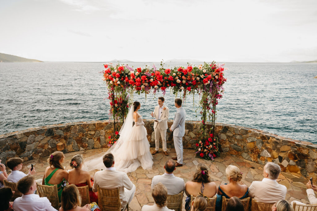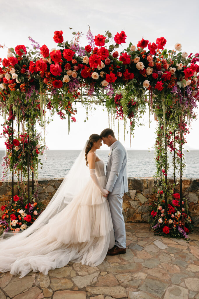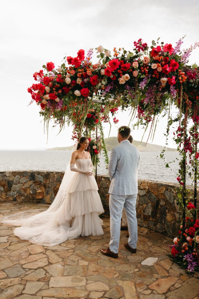 The ceremony arch was an absolute showstopper, overflowing with lush blooms in romantic tones. Every corner of the decor was adorned with flowers, creating an atmosphere that felt luxurious yet full of island charm. They exchanged their vows surrounded by their closest friends and family, while the waves crashed below them there were cheers of pure excitement and joy!