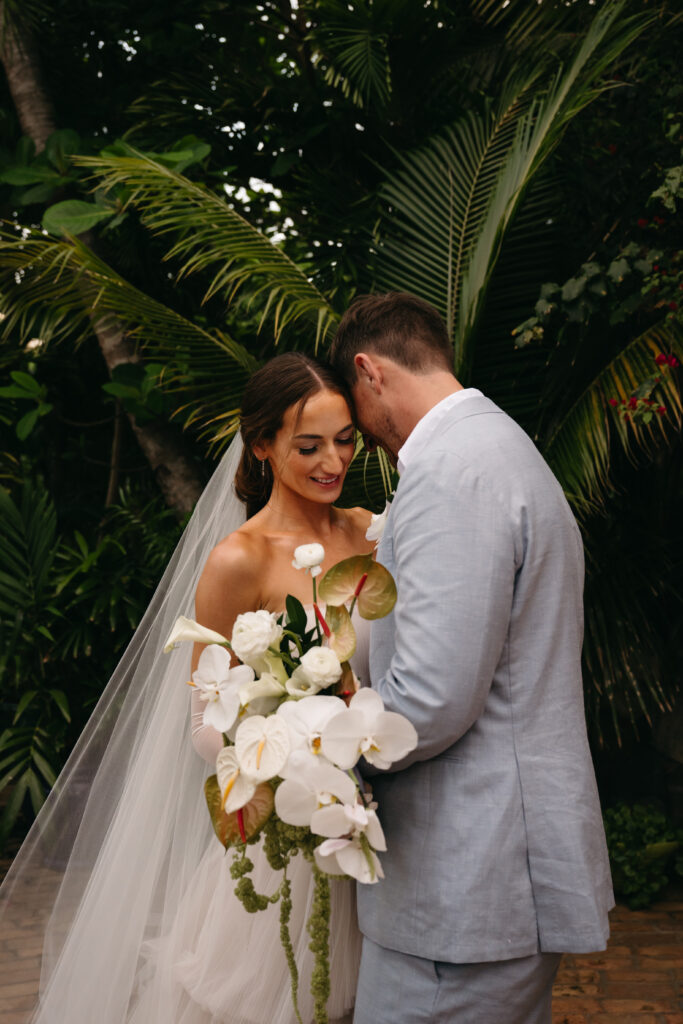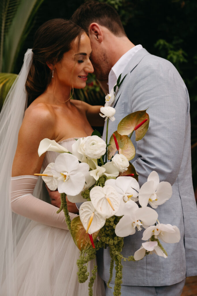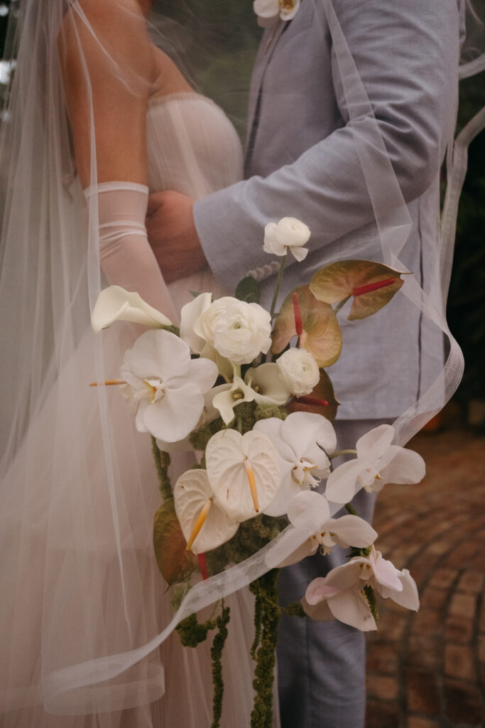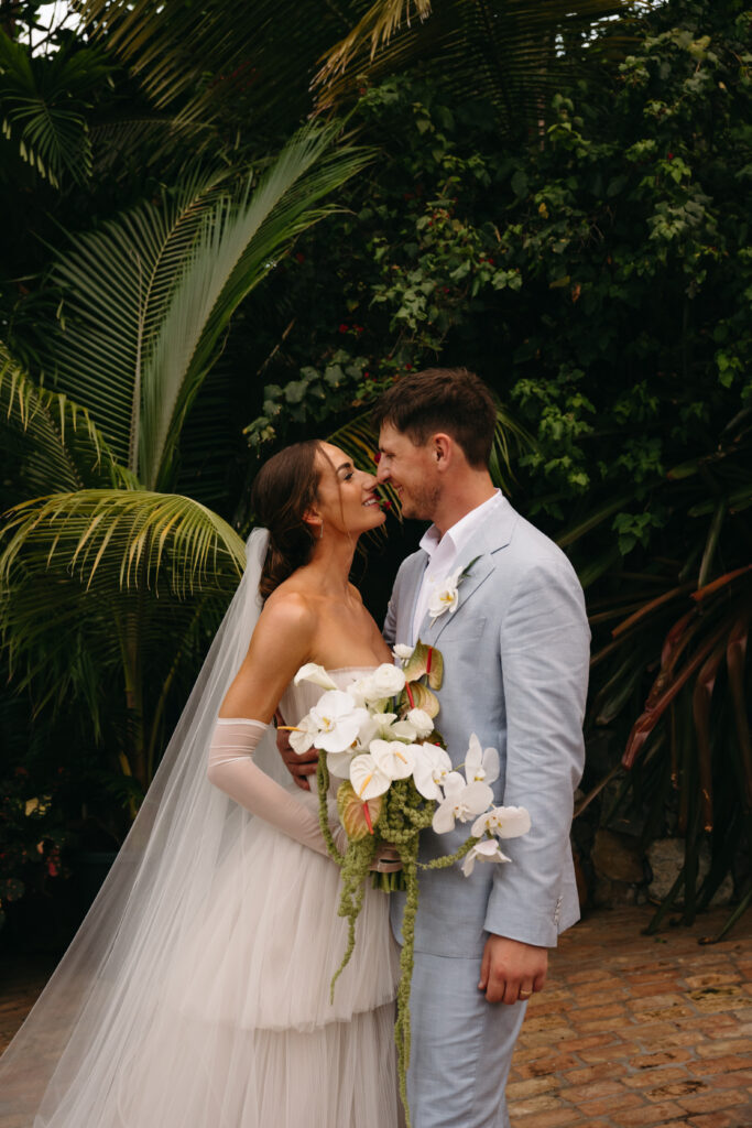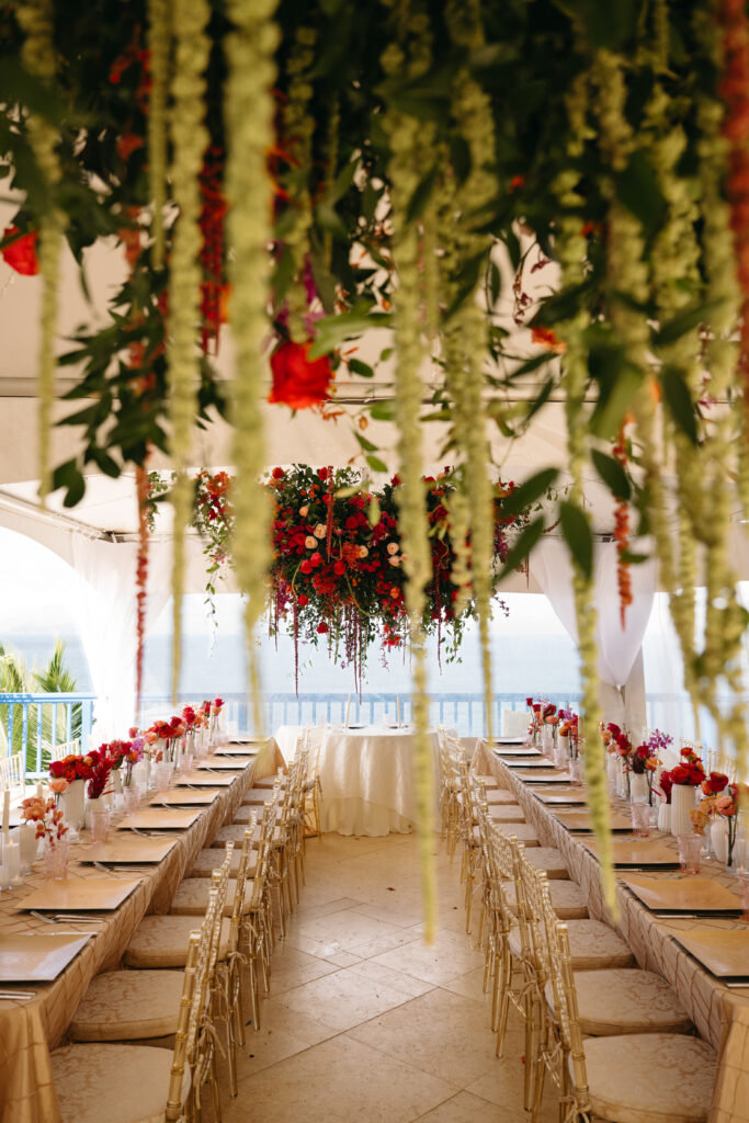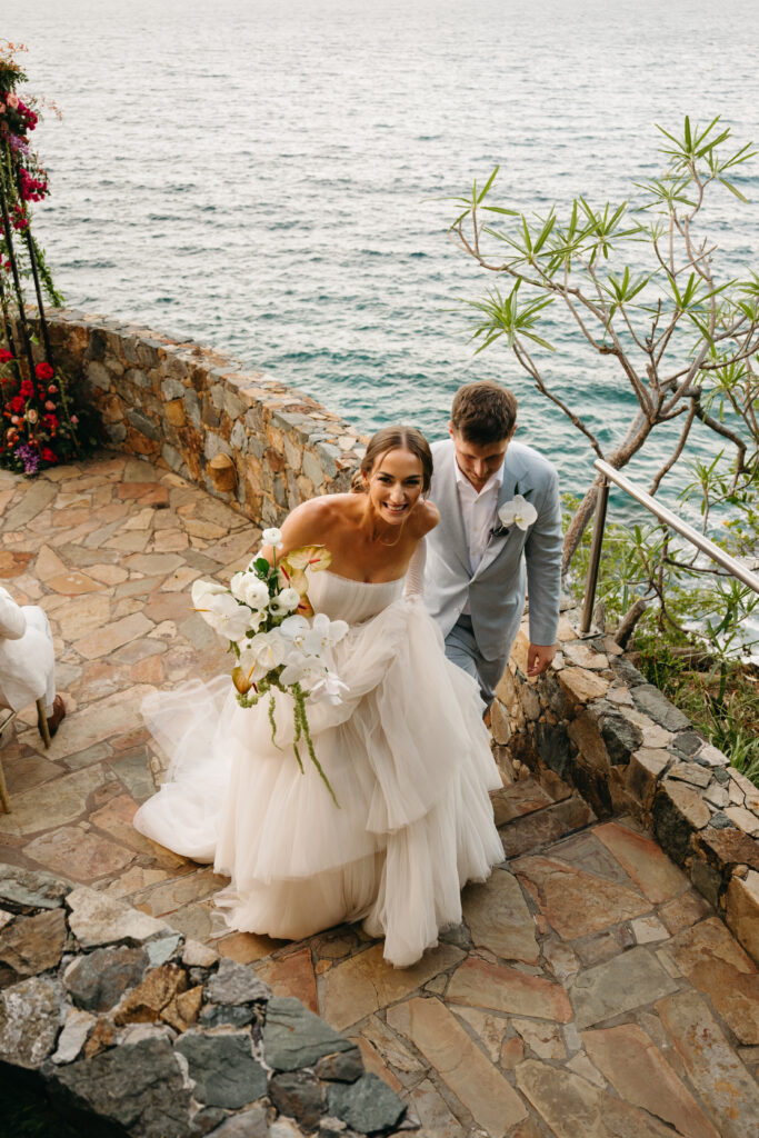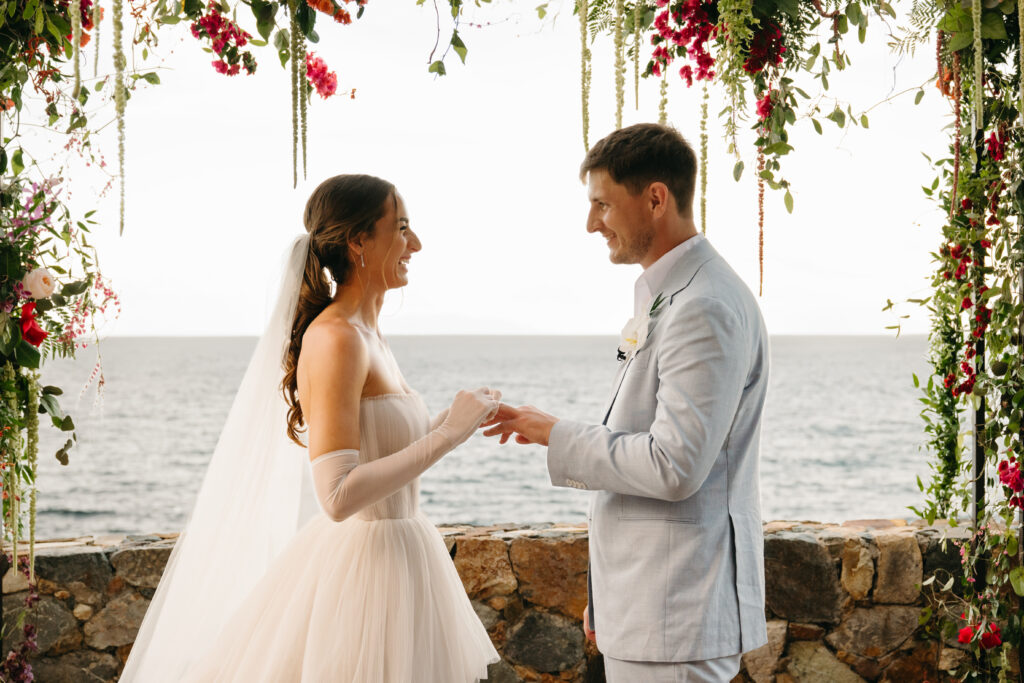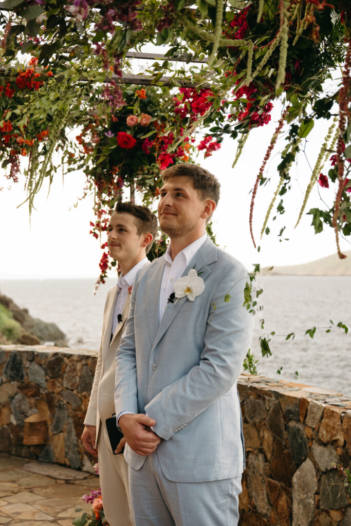 The ceremony arch was an absolute showstopper, overflowing with lush blooms in romantic tones. Every corner of the decor was adorned with flowers, creating an atmosphere that felt luxurious yet full of island charm. They exchanged their vows surrounded by their closest friends and family, while the waves crashed below them there were cheers of pure excitement and joy!